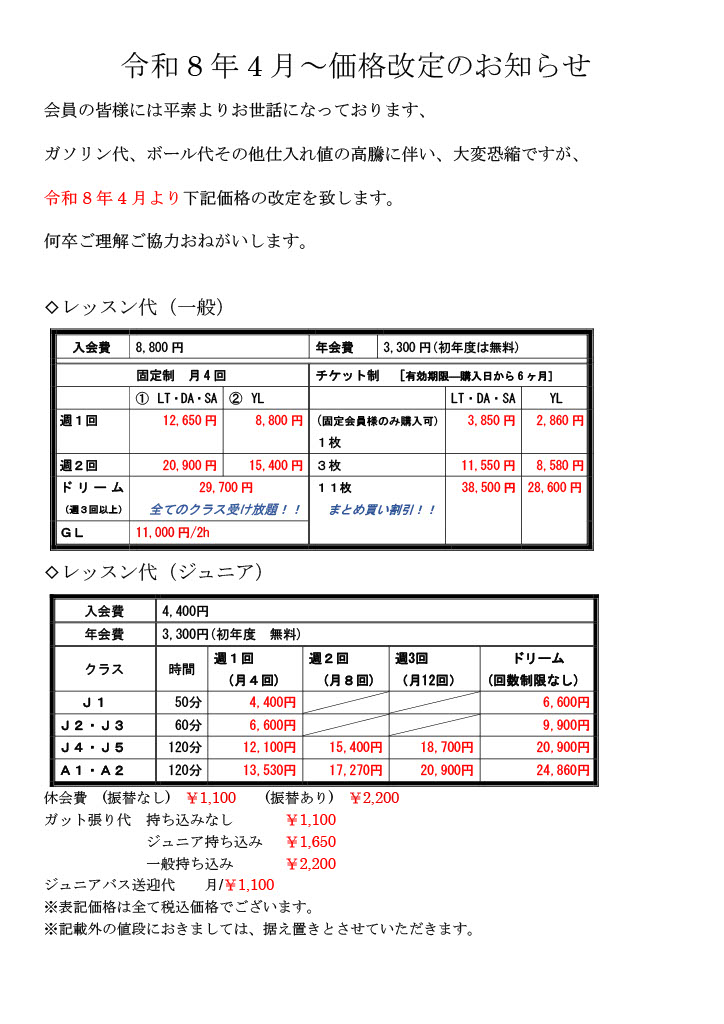 2026/02/25価格改定のお知らせカテゴリー新着情報 会員の皆様には、平素より格別のご愛顧を賜り誠にありがとうございます。 大変心苦しいですが、昨今の物価高に伴い、レッスン料金の改定を行います。 詳細は下記よりご確認ください。 2026/02/25カテゴリー新着情報
